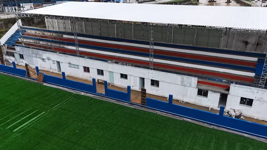 A parte debaixo da arquibancada, conhecida como coberta, segue em obras. Nas imagens, é possível ver paredes derrubadas e sinais nítidos de movimentação no local.