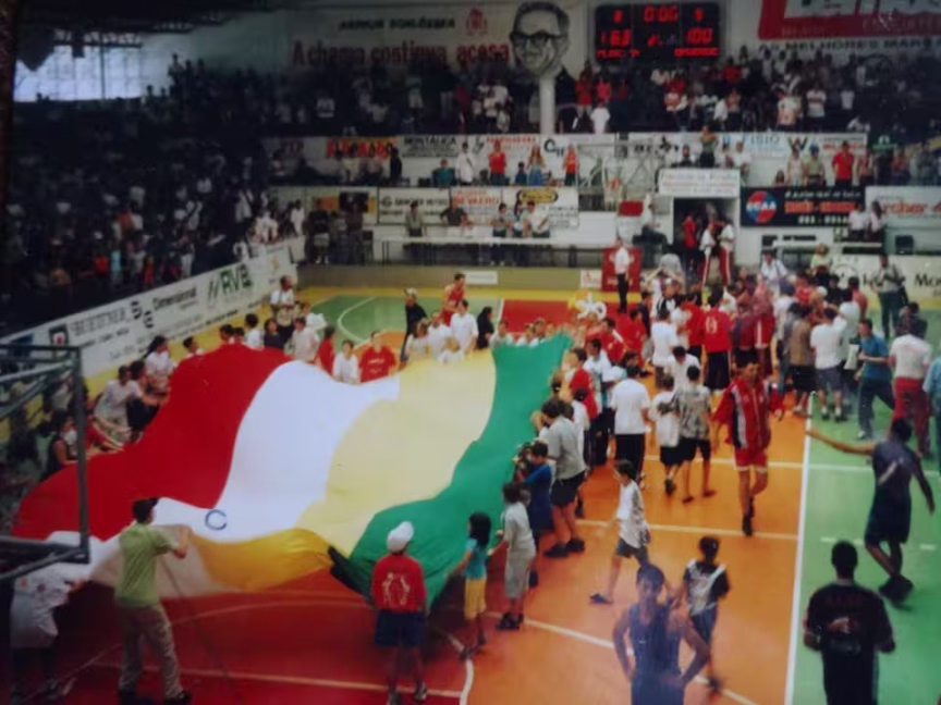 Brusque conquista o ouro no basquete masculino dos Jogos Abertos de Santa Catarina (JASC) em 2000. O certame era realizado em Brusque pela quarta e penúltima vez. Na imagem, festa no ginásio do Bandeirante. Foto postaga por Jaqueline Kuhn no grupo Curto Fotos Antigas de Brusque, no Facebook. Quer compartilhar uma memória do esporte? Envie um e-mail com descrição da imagem e assunto “Memória do Esporte” para [email protected].