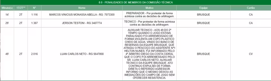 O Brusque e o auxiliar-técnico do clube, Luan Carlos Neto, serão julgados em 8 de junho, terça-feira, no caso da agressão ao assistente de arbitragem Helton Nunes na partida de volta da semifinal do Catarinense contra o Avaí, em 19 de maio. Tanto o clube quanto o profissional serão julgados pela 3ª Comissão Disciplinar do Tribunal de Justiça Desportiva do Futebol de Santa Catarina (TJD-SC) O quadricolor chegou a defender Neto publicamente logo após o ocorrido, utilizando as imagens da transmissão da partida para provar que não era ele quem havia arremessado um copo d'água no pescoço de Helton Nunes. O auxiliar-técnico foi citado na súmula pelo árbitro Bráulio da Silva Machado como o responsável, tendo como referência o relato do quarto árbitro da partida, Diego da Costa Cidral. Conforme a denúncia da procuradoria, o Brusque responderá pelo Artigo 213 inciso III do Código Brasileiro de Justiça Desportiva (CBJD). A pena prevista por casos do tipo é multa de R$ 100 a R$ 100 mil. Dependendo do julgamento, cabe perda de mando de campo de uma a dez partidas na competição em que ocorreu o incidente. Já Luan Carlos Neto responderá pelo Artigo 254-A, parágrafo terceiro, que trata de agressão à arbitragem, e prevê suspensão de, no mínimo, 180 dias. O Município tentou contato com a defesa do Brusque, que informou que só comentará o caso após o julgamento. A citação em súmula: