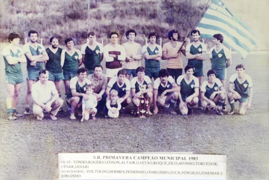 O registro de hoje na sessão Memória do Esporte vem de Nova Trento. Na terra de Madre Paulina, a equipe S.R. Primavera conquistou seu primeiro título municipal em 1983. Em pé estão: Tonho, Rogério, Edson, Altair, Gastão, Roque, Zico, Afonso, um torcedor não identificado, César e Janari. Agachados: Voltolini, Hermes, Pedrinho, Jânio, Idjio, Juca, Vergilio, Josemar e Jorginho.