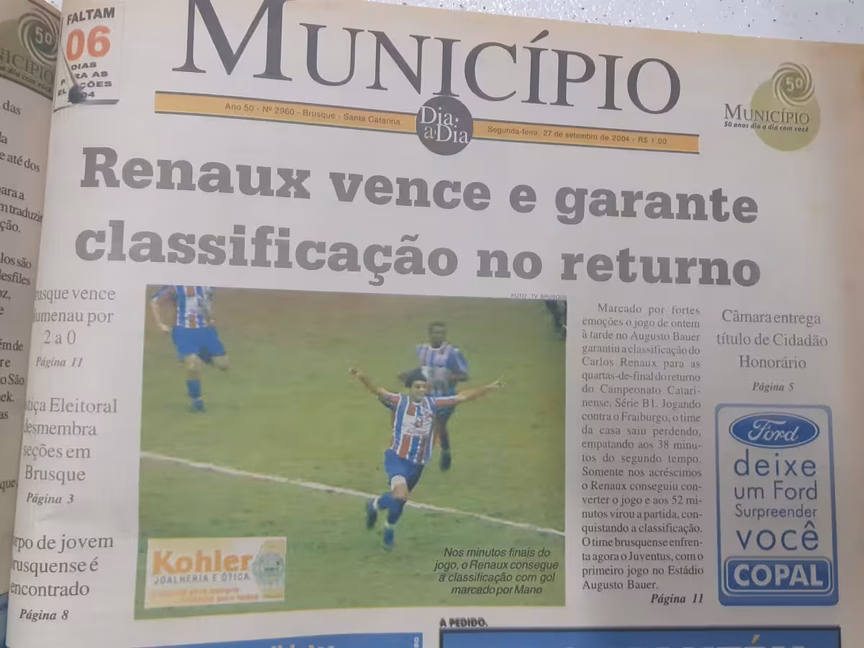 Em 26 de setembro de 2004, o Carlos Renaux obteve uma classificação dramática às quartas de final do returno da Série B1 (atual C) do Campeonato Catarinense. Venceu o Fraiburgo por 2 a 1 de virada no Augusto Bauer. No final do jogo, Ximbica sofreu pênalti e Mano (foto) guardou para comemorar a classificação, já aos 52 da segunda etapa. Ele marcou os dois gols do Vovô na partida. A foto ilustrou a capa da edição do dia seguinte de O Município, que ainda se chamava Município Dia-a-Dia.