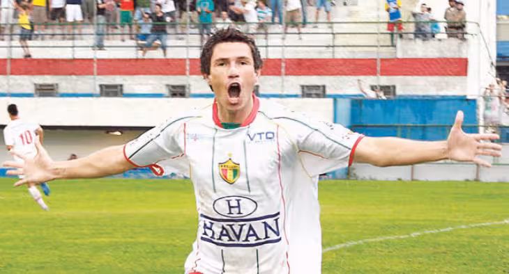 Flávio Guilherme marca o primeiro gol da vitória do Brusque sobre o Joinville por 3 a 0 em 29 de janeiro de 2009. O quadricolor alcançava, após aquela vitória, o G4 do Campeonato Catarinense. Quer compartilhar uma memória do esporte? Envie um e-mail com descrição da imagem e assunto “Memória do Esporte” para [email protected].