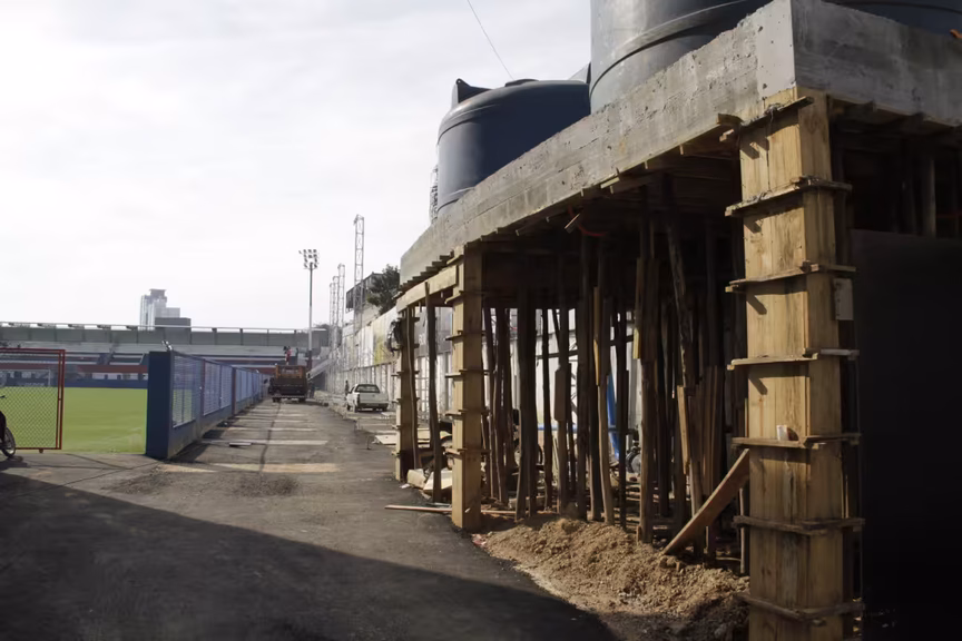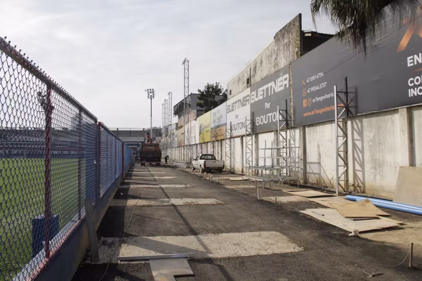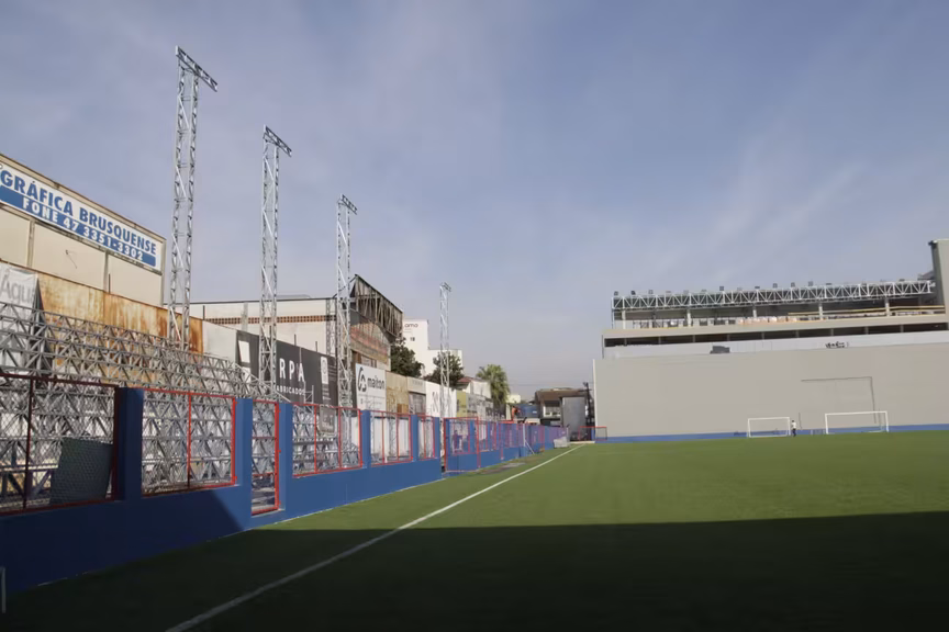 Em relação à reestreia do Brusque, há outras etapas para concluir, e elas não têm a ver com a obra principal do estádio. É necessário concluir e liberar as arquibancadas metálicas, localizadas no lado oposto das arquibancadas principais, onde ficam as cabines de imprensa. Esta obra é resultado de um convênio entre Carlos Renaux e Prefeitura de Brusque. As arquibancadas estão sendo montadas.
