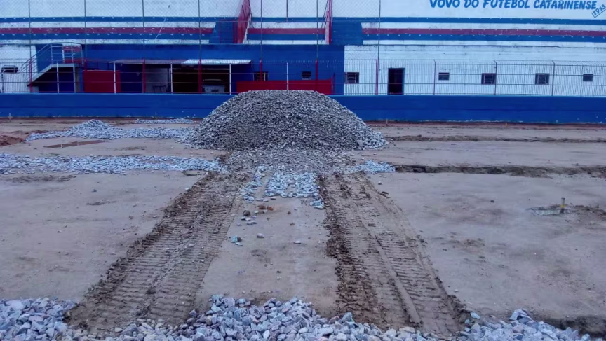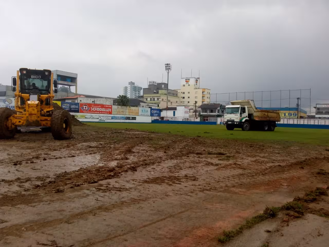 O diretor de Patrimônio do Brusque FC, Marciano Giraldi, explica que as chuvas desta semana atrasaram o cronograma, mas que os trabalhos foram retomados nesta quinta-feira, 19.