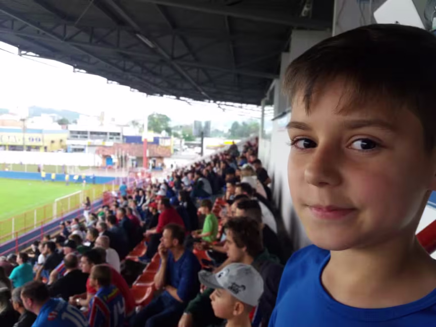 Engana-se quem pensa que apenas os saudosistas visitaram o Gigantinho no sábado. Aí está o Carlos Eduardo, de 9 anos, prestigiando o clube o qual joga pela categoria Mirim, representando a categoria da nova geração de tricolores. Ele foi ao estádio com os pais e o avô Abrão Colzani, não esquecendo de usar a camisa azul do clube para fortalecer a torcida.