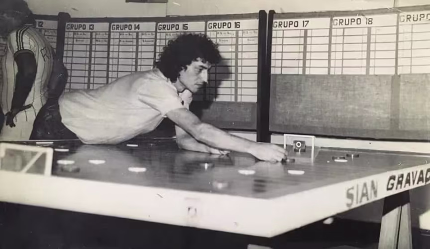 O futebol de mesa, também chamado de futebol de botão, foi um fenômeno entre as décadas de 1960 e 1990, e até hoje encontra adeptos, embora em menor número. Na imagem está o brusquense Nelson Bertolini, o Nelsinho, representando a Associação Brusquense de Futebol de Mesa no décimo primeiro Campeonato Brasileiro da modalidade. O ano é 1984, e a competição foi realizada em Santana do Livramento (RS).