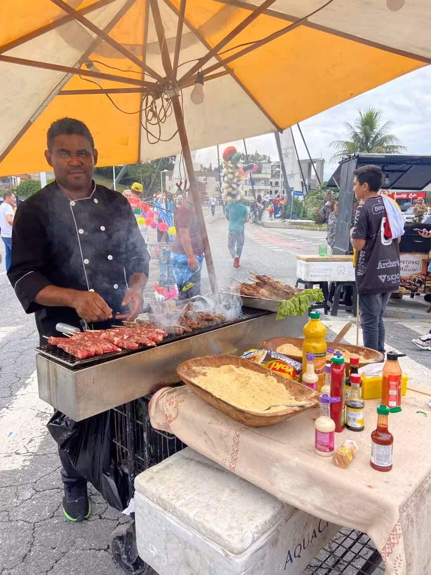 Ademar Pereira dos Santos veio de Bombinhas para vender churrasquinho em frente ao estádio Augusto Bauer. Ele sempre vende o produto nos jogos do Brusque e no sábado chegou ao estádio às 13h. A expectativa dele era vender os 500 espetinhos que trouxe em sua barraquinha.