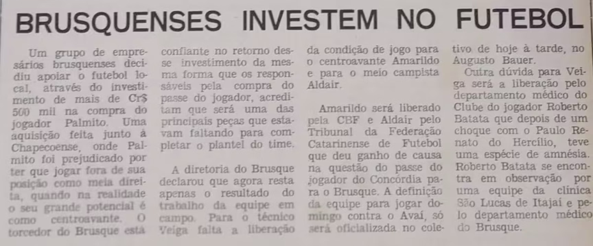 "Era terrível para conseguir um apartamento para alugar. A diretoria quis me colocar em um hotel. Minha esposa concordou em ficar em Joinville, eu era recém-casado, minha filha era pequena. Eu ficava em Brusque e ia para Joinville quando não tinha jogo, ficava um, dois dias, e voltava."
