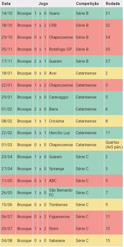 Com o empate em 0 a 0 com o Itabaiana nesta segunda-feira, 4, o Brusque chega a 20 jogos disputados no Augusto Bauer desde a reforma do estádio, em 2024, e tem 48,33% de aproveitamento dos pontos disputados. São oito vitórias, cinco empates e sete derrotas. O quadricolor vive sequência de quatro partidas sem vencer em casa, com poucos gols marcados.
