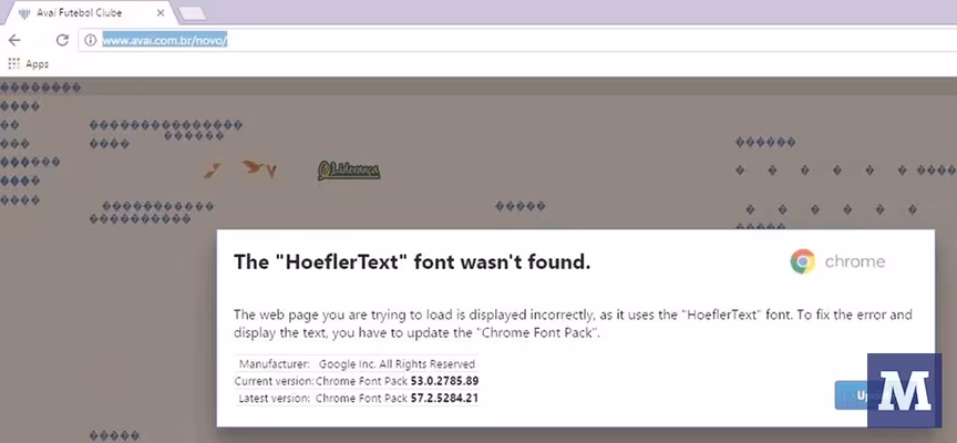 Há algumas semanas, a imprensa da capital noticiou com sarcasmo erro no site do Brusque. Em manutenção, o portal do quadricolor dizia que seu endereço ficava em Florianópolis. Bola fora, mas o que dizer, então, do portal do Avaí, que foi infectado por vírus? Quem tentou abrir o site viu uma mensagem em inglês solicitando a instalação de um tal 'Chrome Font Pack'. Em rápida pesquisa na internet, descobre-se que trata-se de um malware, ou seja, uma espécie de vírus que pode servir para espionar o seu computador e até roubar dados importantes, como relacionados a contas bancárias.