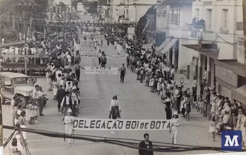 Cinco anos depois da primeira edição dos Jogos Abertos de Santa Catarina (Jasc), a competição voltou a ser realizada em Brusque. Há 51 anos, os municípios participantes retornaram ao berço da principal competição poliesportiva do estado e desfilaram com suas delegações pelo centro da cidade. Na foto, a representação de Lages passa pelas ruas brusquenses. Os lageanos são conhecidos como 'bois de botas' porque, durante a Guerra Farroupilha, um pelotão da cidade levava armas carregadas por bois que atolaram em um lamaçal, e no fim das contas os próprios soldados precisaram puxar tanto bois quanto armas.