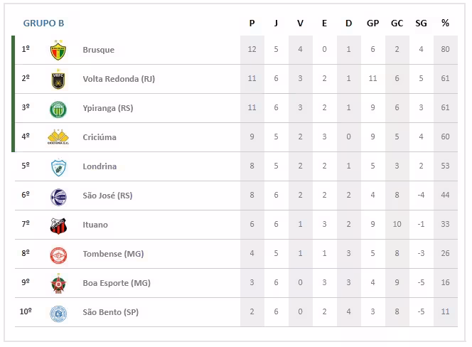 A sexta rodada da Série C do Campeonato Brasileiro encerrou neste sábado, 12, e o Brusque Futebol Clube se manteve na liderança do grupo B. A posição foi confirmada mesmo com um jogo a menos.