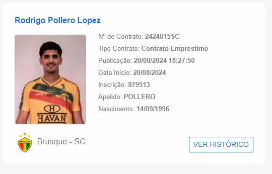O centroavante Rodrigo Pollero está regularizado e pode entrar em campo pelo Brusque. Seu vínculo com o quadricolor foi publicado às 18h27 desta terça-feira, 20, no Boletim Informativo Diário (BID) da CBF. O uruguaio de 27 anos pode, então, jogar contra o Goiás na partida que começa às 21h desta quarta-feira, 21, na Serrinha, pela 22ª rodada da Série B.