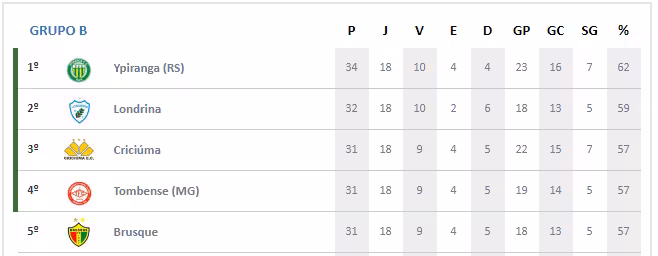 Caso o Brusque vença o próximo jogo, válido pela 13ª rodada, chegará aos 30 pontos, mas poderá ficar fora do G-4 ao fim da primeira fase. A diferença poderia ser tanto por saldo de gols quanto por número de pontos. Cenários com Tombense (MG), Criciúma, Ypiranga (RS) e Londrina se classificando ainda são possíveis. O Volta Redonda, atual sexto colocado, continuaria tendo chances de entrar no G-4 sem que o Brusque esteja nele ao fim da 18ª rodada.