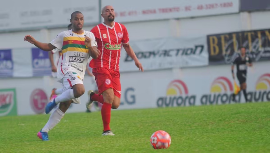 Júnior Pirambu abre o placar contra o Manaus: partida teve o maior público do ano no Augusto Bauer | Foto: Marcio Costódio/Arquivo O MunicípioEdílson disputa bola contra o Hercílio Luz no Catarinense: pior público da equipe no estadual foi o sexto menor no ano | Foto: Marcio Costódio/Arquivo O Município