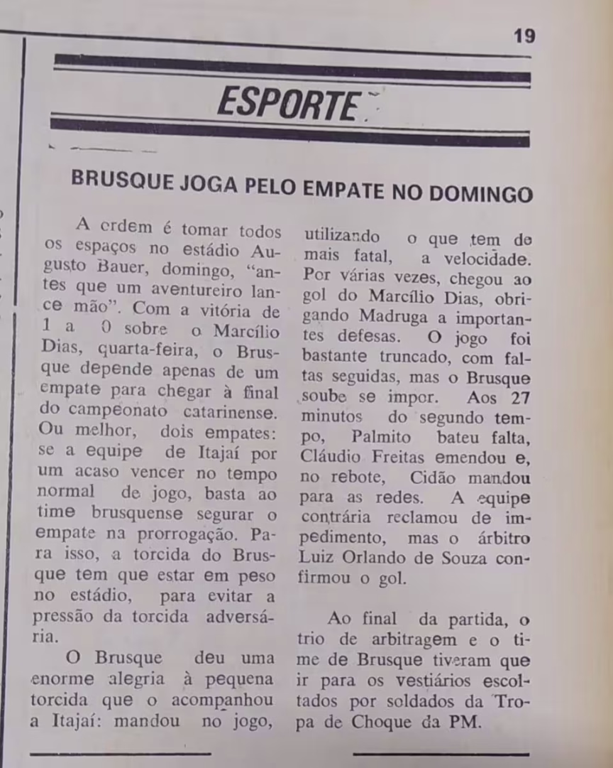 Em 26 de novembro de 1992, nas quartas de final, contra a Chape, o Brusque estava obtendo uma surpreendente vitória por 3 a 0 fora de casa, já no primeiro tempo do jogo de ida. Cláudio Freitas e Palmito (duas vezes) marcaram os gols. Contudo, o que ocorreu no intervalo quase pôs tudo em risco.