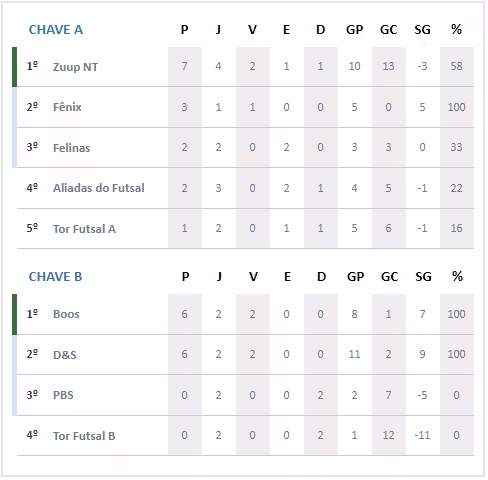 No naipe feminino, o Boos Futsal garantiu sua sequência na competição ao golear o Tor Futsal B por 6 a 1. Na última rodada da Chave B, o Boos enfrenta o D&S e precisa de pelo menos um empate para passar direto às semifinais, sem passar pela repescagem.
