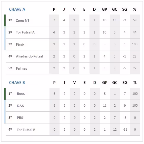 No único jogo do naipe feminino, o Tor Futsal A goleou as Felinas por 5 a 0 e entrou na zona de classificação para a repescagem. Quem vai definir os rumos da Chave A é o atual campeão, Fênix, que só jogou uma partida até agora, vencida sobre o Zuup NT. Ainda precisa enfrentar Tor Futsal A, Aliadas do Futsal e Felinas, nos três jogos restantes do grupo.