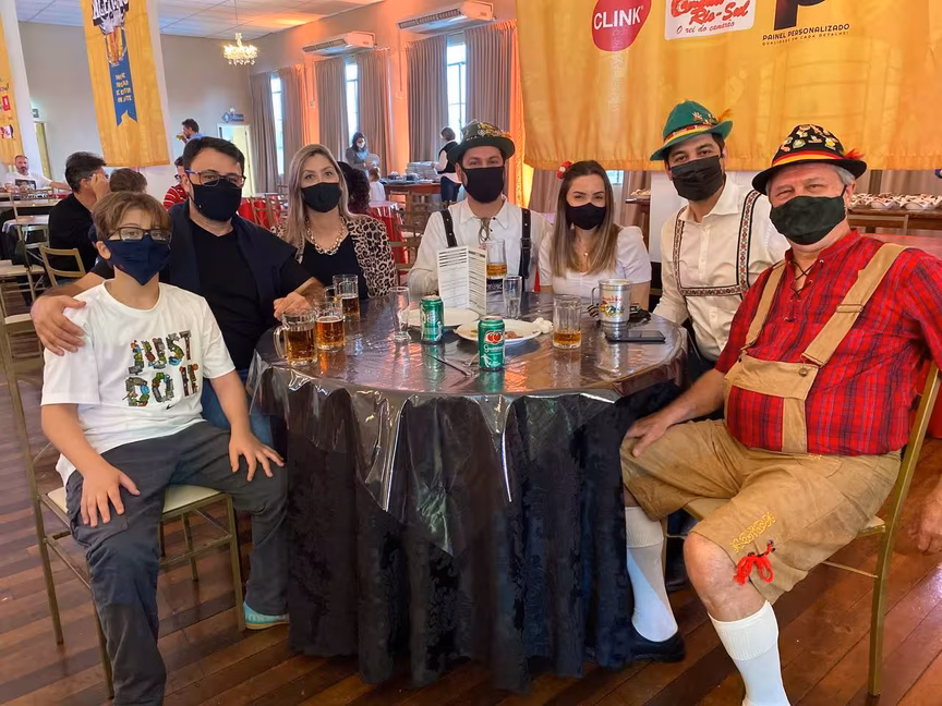 A mesa foi reservada pela professora Fernanda Cerchiari, 43. “Sempre que tem uma coisa diferente na cidade, convidamos eles para estarem participando. É muito organizado, tudo o que o Schmitt promove é. A gente se sente bem à vontade, por estarmos vacinados, mas sempre tomando todos os cuidados”, complementa.