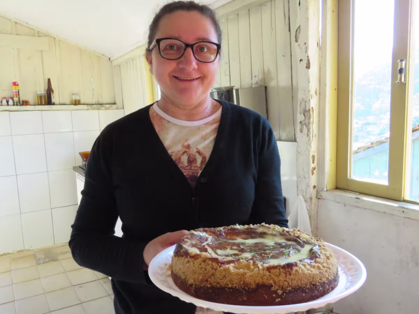 Depois de muito tentar, ela finalmente conseguiu fazer a cuca com a tradicional massa alemã, que leva ovo, leite, manteiga, fermento seco e açúcar.