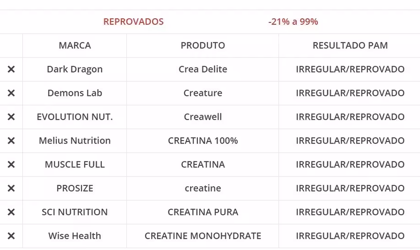 O dado mais interessante do laudo foi a constatação de que dez marcas, fabricadas por quatro empresas, não continham nenhuma grama de creatina no produto. Nesta situação, uma empresa fabrica sozinha cinco das dez marcas reprovadas.