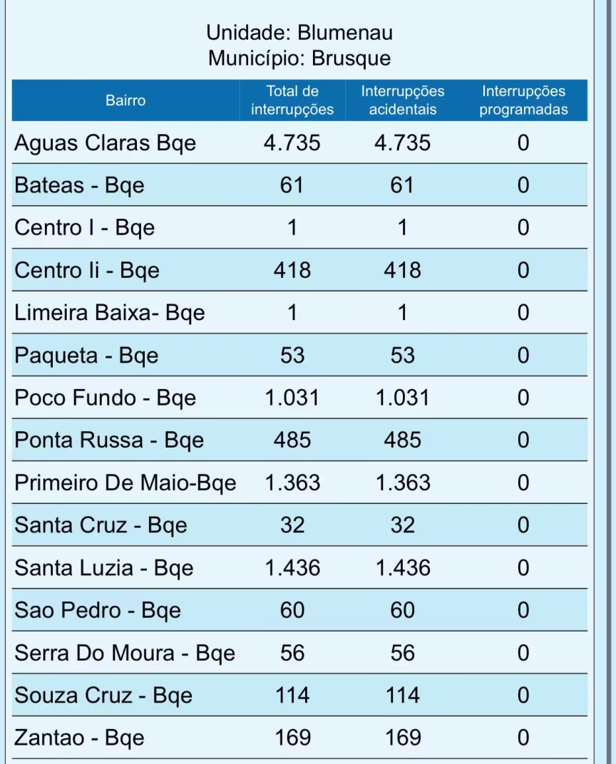 Os dados apontam que os bairros mais afetados foram Águas Claras, com 4.735 unidades sem energia, Santa Luzia (1.436), Primeiro de Maio (1.396) e Poço Fundo (1.031).