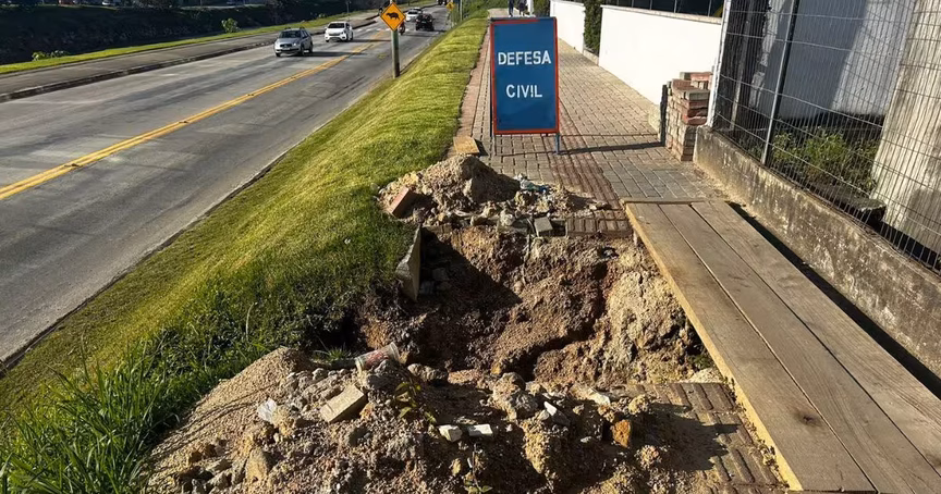 Um buraco está aberto na calçada da avenida Bepe Roza, popular Beira Rio, próximo à passarela. Uma placa da coordenadoria municipal de Defesa Civil indicando o buraco à frente foi colocada no local. Um pedaço de madeira permite a travessia de moradores.