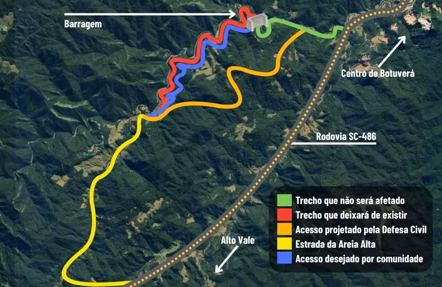 Sabendo disso, a Secretaria de Proteção e Defesa Civil do estado planeja atender ao pedido da comunidade por uma nova via. Entretanto, a pasta responsável pela gestão da futura barragem prevê viabilizar um acesso no topo do morro do bairro.