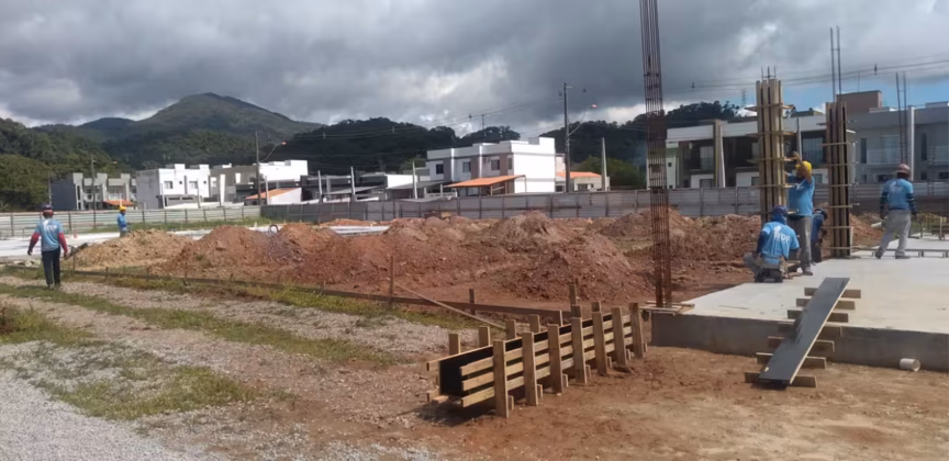 A obra está com aproximadamente 16% de seus serviços realizados. No momento, a empresa executa a supraestrutura com o levantamento de pilares e das vigas do pavimento superior.