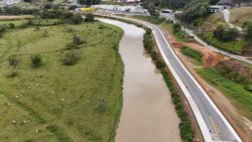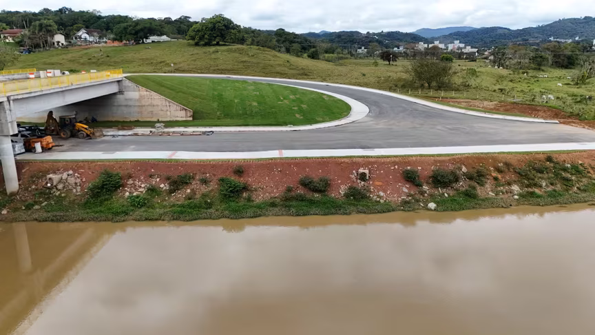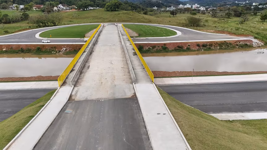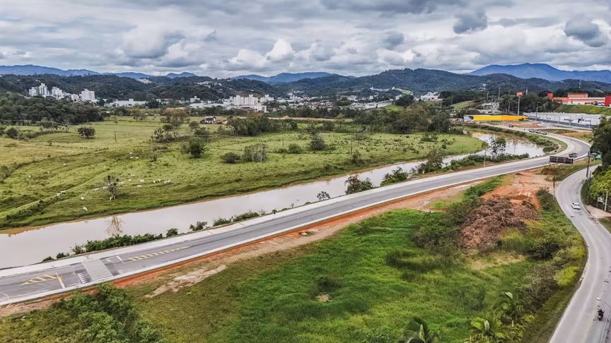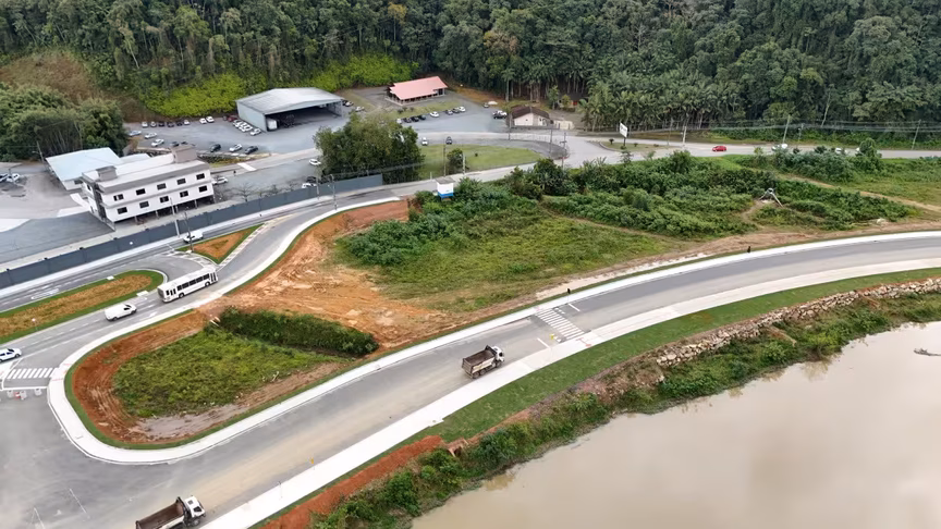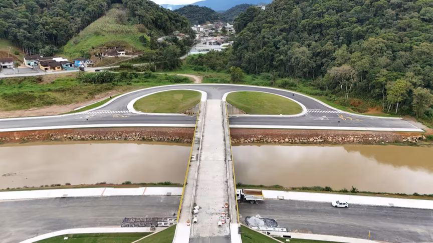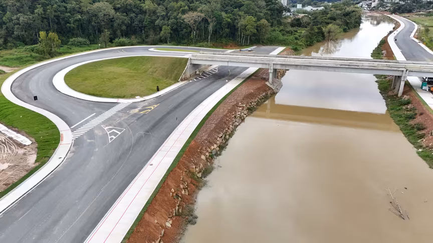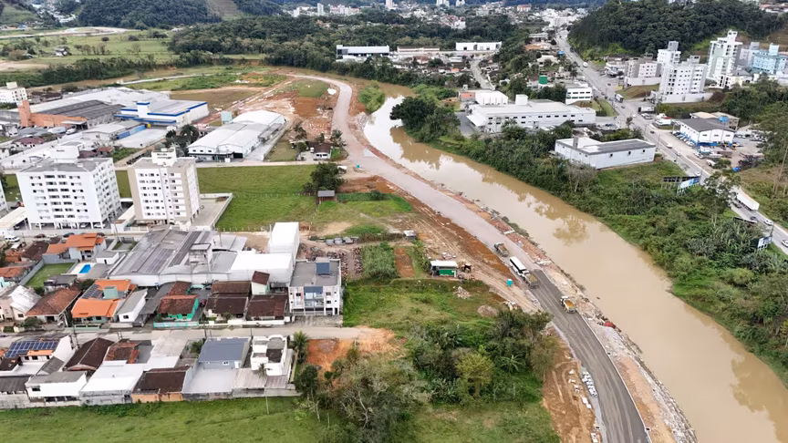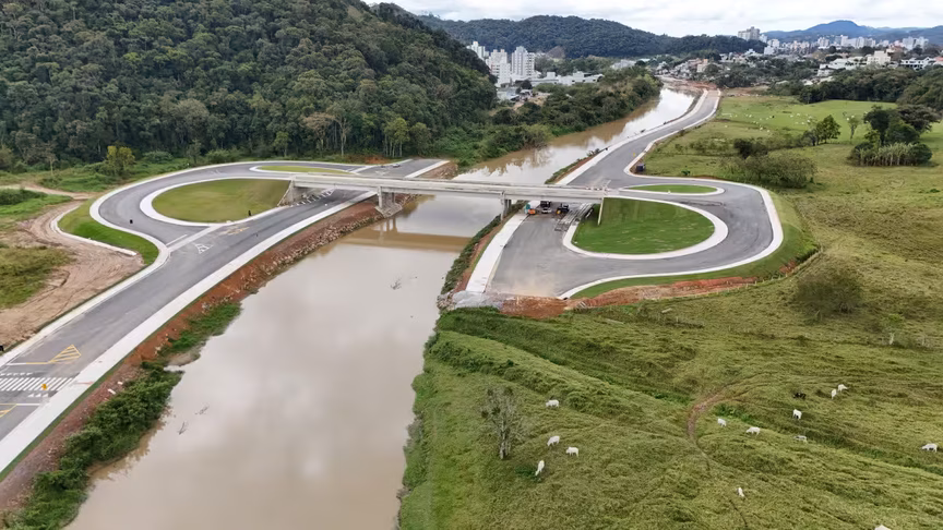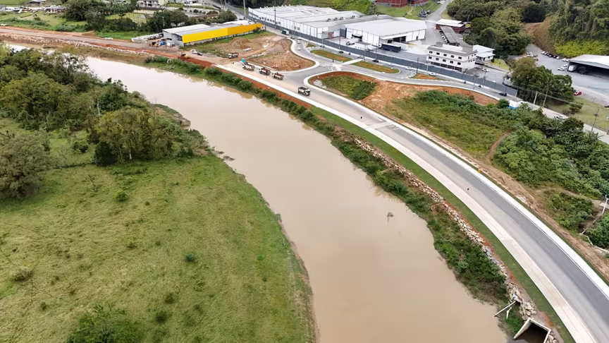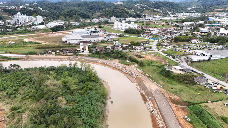 Vistas do alto, as intervenções ganham nova dimensão e permitem observar não apenas a grandiosidade do projeto, mas também como ele transformará a mobilidade urbana e a paisagem às margens do rio Itajaí-Mirim.