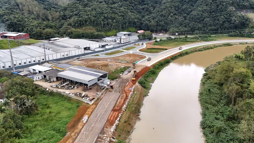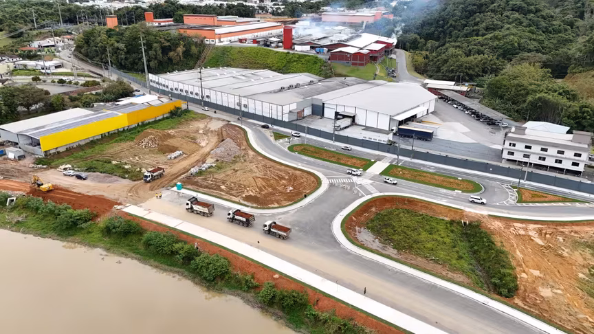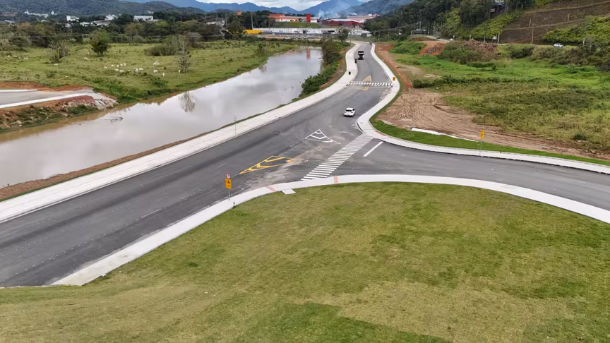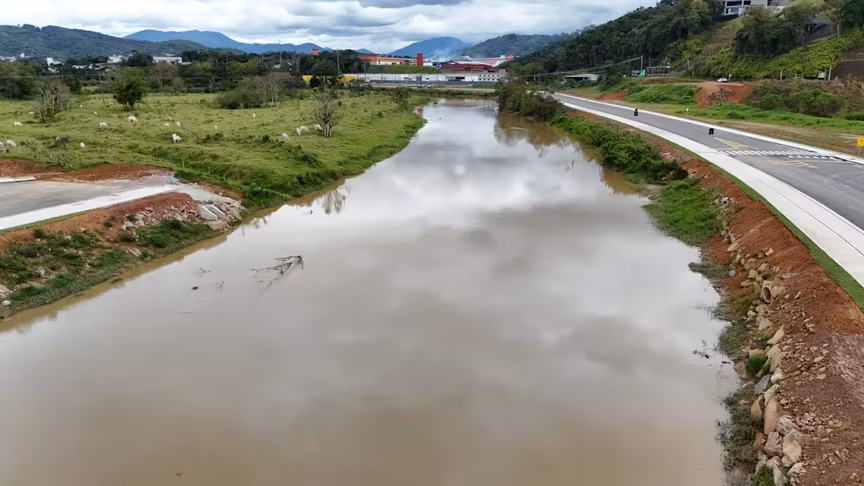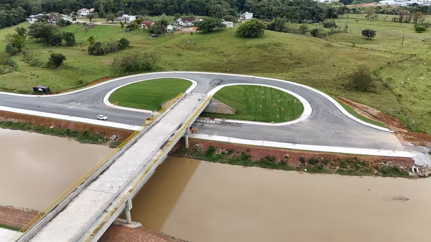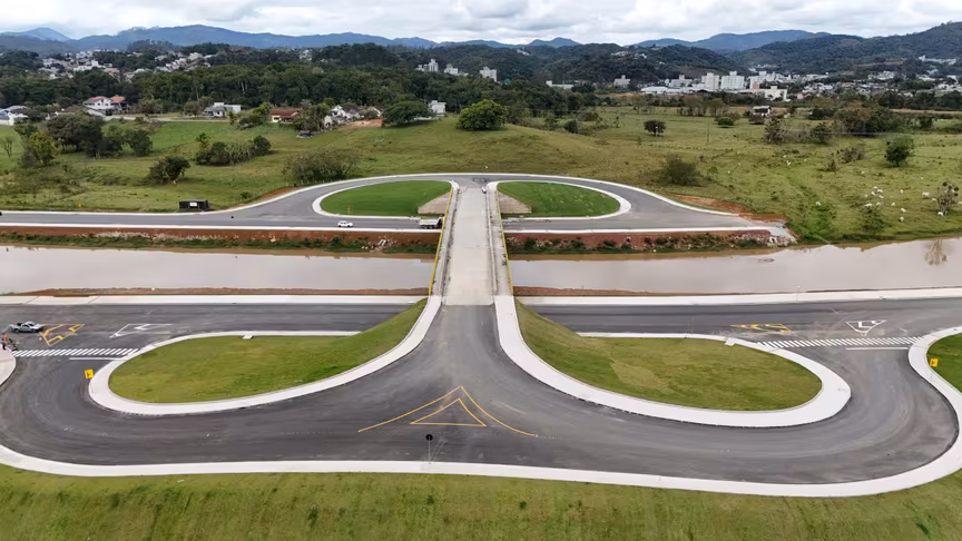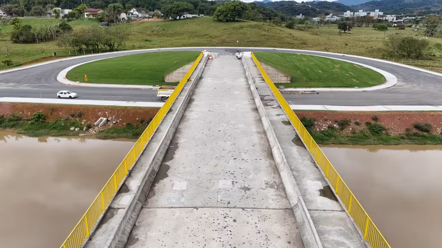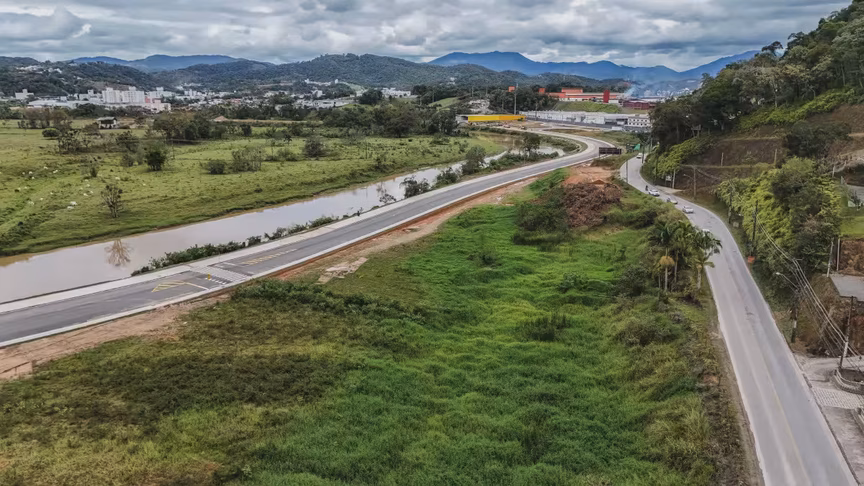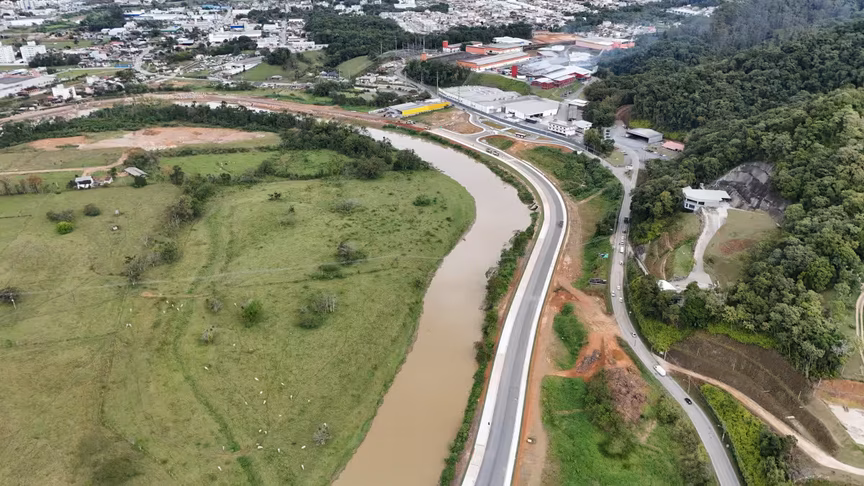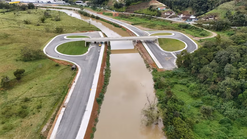 Vistas do alto, as intervenções ganham nova dimensão e permitem observar não apenas a grandiosidade do projeto, mas também como ele transformará a mobilidade urbana e a paisagem às margens do rio Itajaí-Mirim.