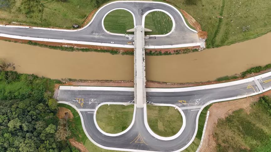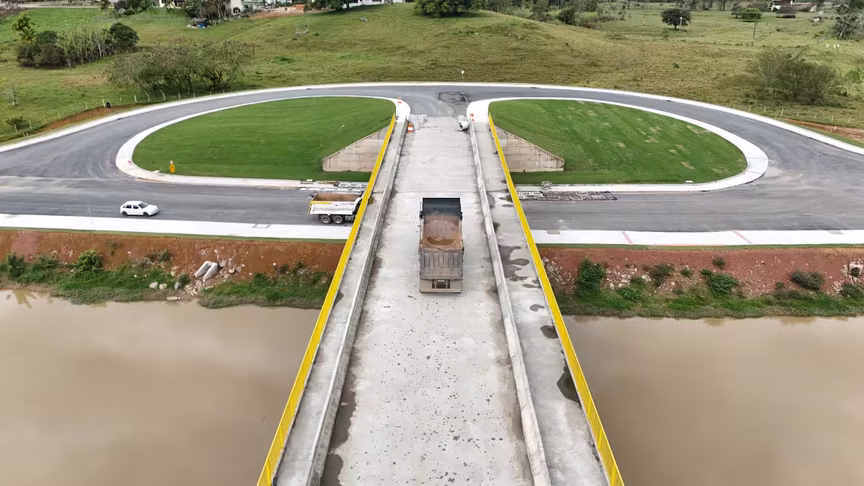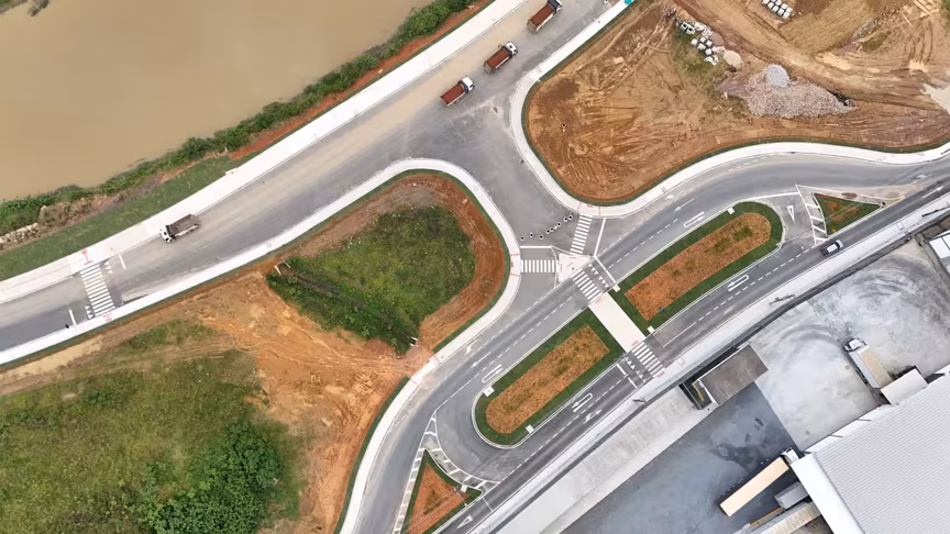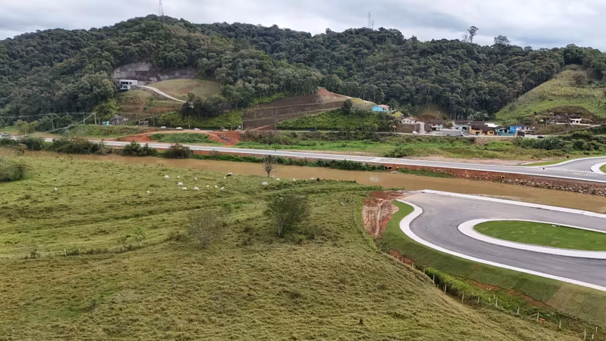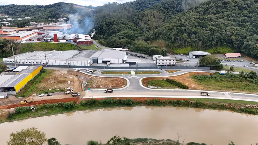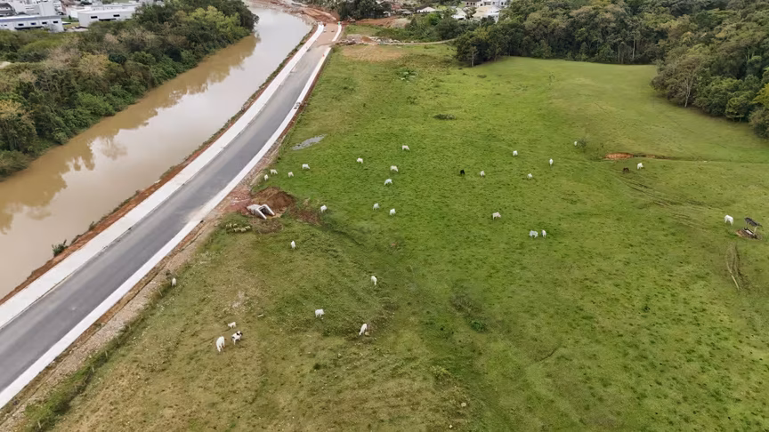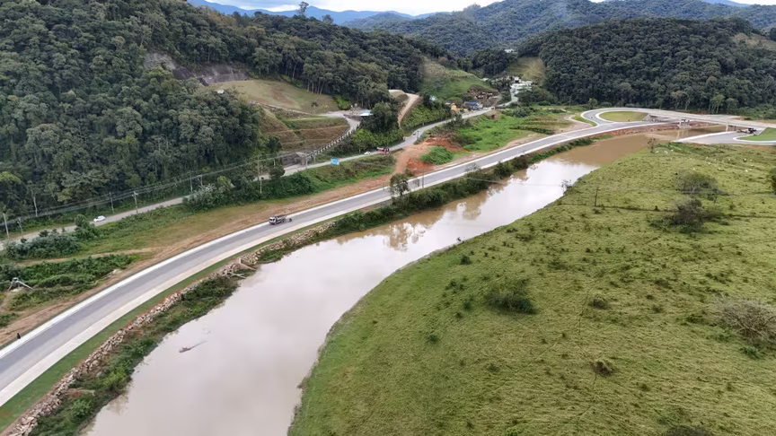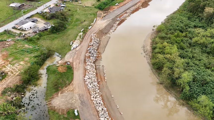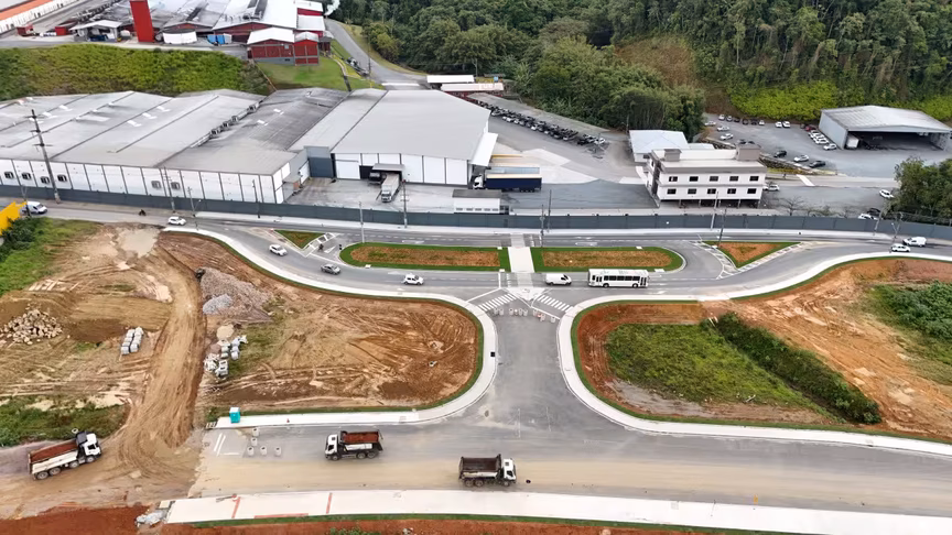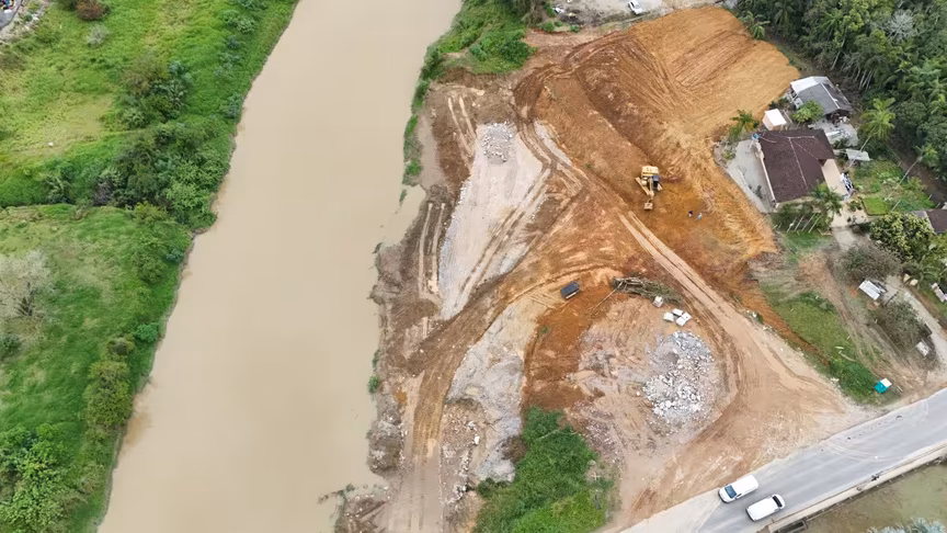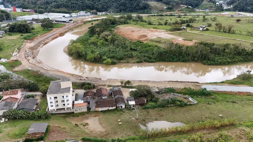 Vistas do alto, as intervenções ganham nova dimensão e permitem observar não apenas a grandiosidade do projeto, mas também como ele transformará a mobilidade urbana e a paisagem às margens do rio Itajaí-Mirim.