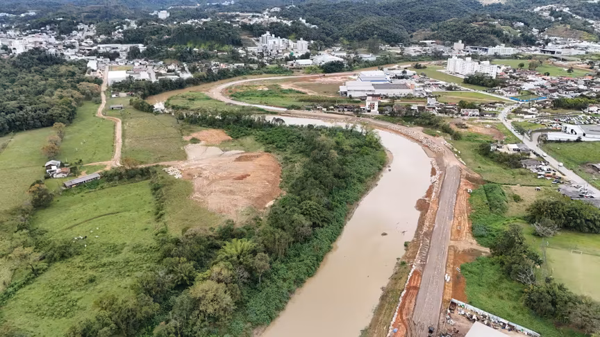 Imagens aéreas capturadas nesta quinta-feira, 28, destacam o avanço e a imponência das obras da nova Beira Rio em Brusque, especialmente nos trechos que compreendem os lotes 1 e 2, entre os bairros Rio Branco e Guarani.