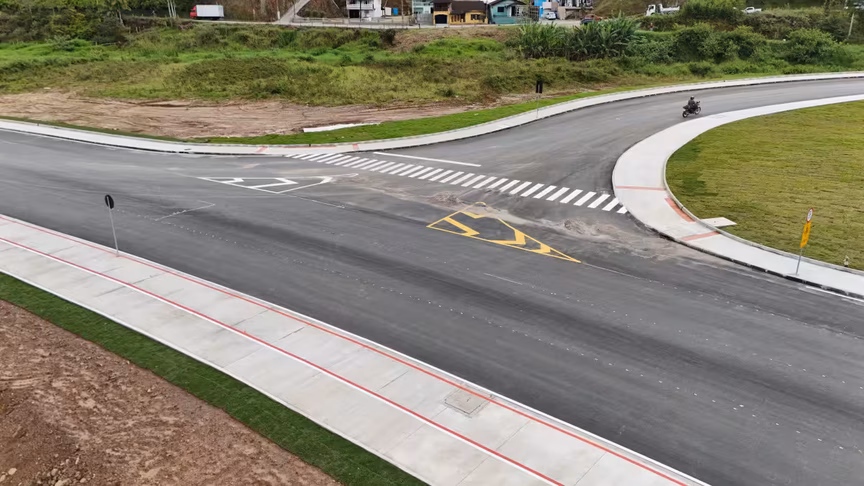 Segundo as últimas atualizações divulgadas pelo jornal O Município, o lote 1 — entre o Instituto Federal Catarinense (IFC) e a empresa Irmãos Hort, no bairro Rio Branco — já está pavimentado, com calçadas e drenagem concluídas, restando apenas os ajustes finais de iluminação e sinalização.