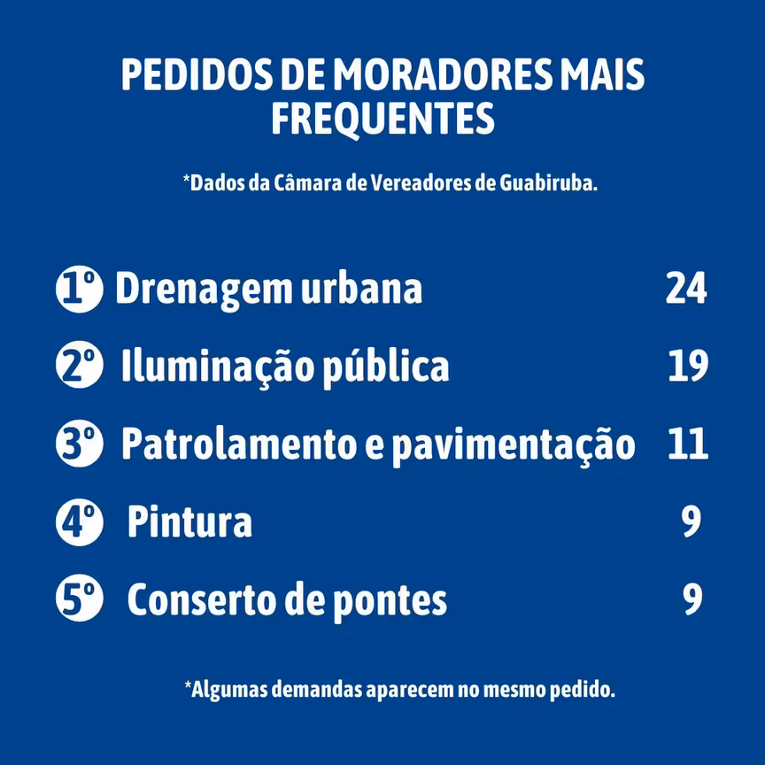 Em terceiro lugar, está o patrolamento e pavimentação de ruas, com 11 demandas. A pintura de meio-fio, faixas de pedestre, travessias elevadas ou vagas de estacionamento e a reforma, alargamento, manutenção, substituição e conserto do guarda-corpo de pontes, representam nove envios cada.