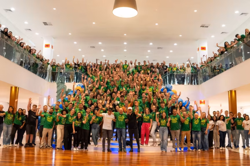 Ao som do hit, Brenno e Matheus foram recebidos pelos funcionários, que aguardaram no hall de entrada.