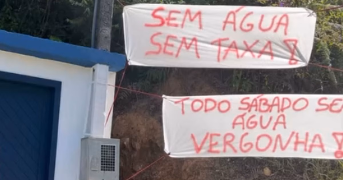 Nas faixas penduradas, está escrito: “sem água, sem taxa” e “todo sábado sem água; vergonha”.