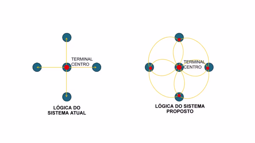 Com a nova configuração, o terminal central seria interligado aos quatro novos terminais, permitindo que os passageiros se desloquem diretamente entre bairros ou troquem de ônibus ao longo do trajeto, sem a necessidade de passar obrigatoriamente pelo Centro.