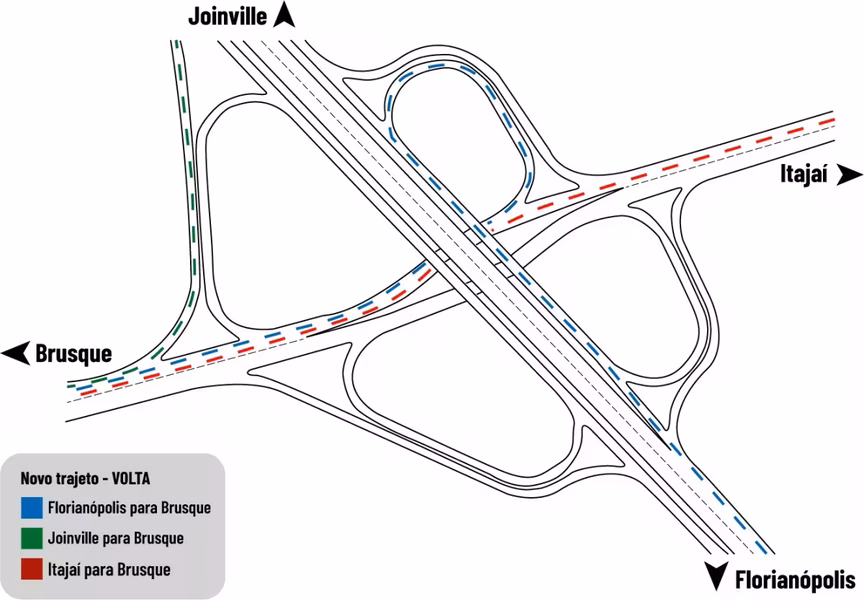 Já quem vem do Norte para Brusque, entrará na Antônio Heil direto, como é atualmente. Para ir de Brusque sentido ao Sul do estado, a saída para a BR-101 será livre.