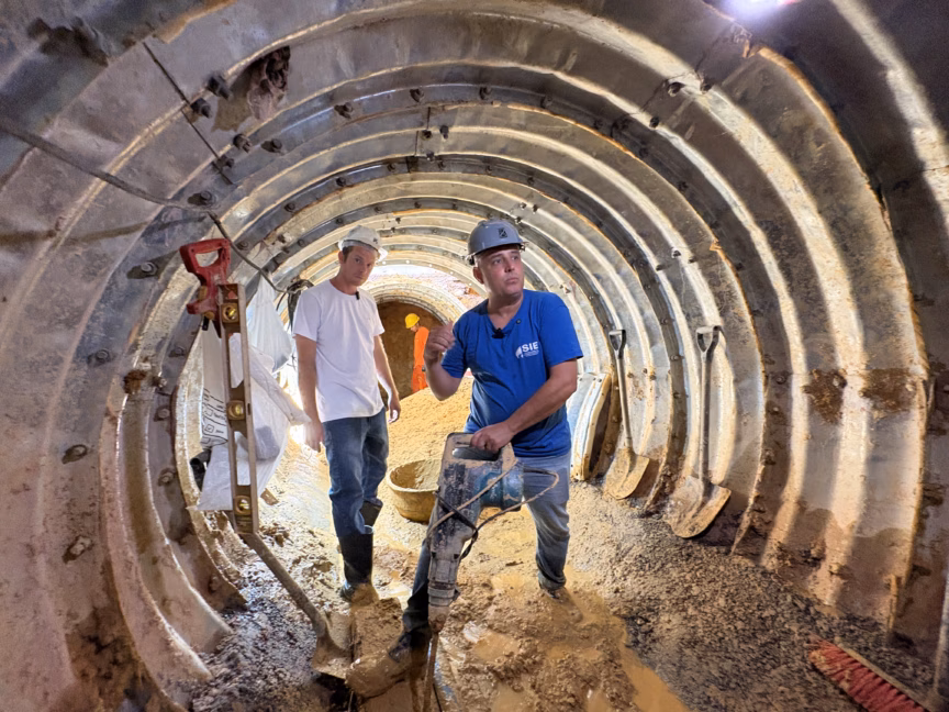 Em um dos túneis em execução, com cerca de 50 metros de extensão, já foram utilizados mais de 110 anéis. No total, dois túneis e duas frentes de galeria estão em operação, com equipes de seis a sete trabalhadores em cada ponto.
