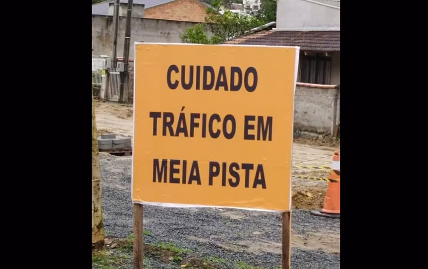 Placa com erro de digitação em Blumenau alerta motoristas para “tráfico em meia pista” 01/07/2021 • Redação O Município