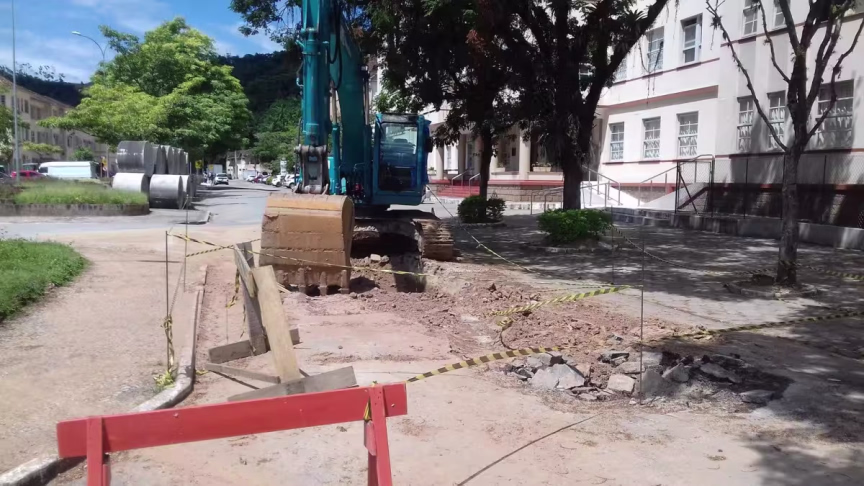 Paralisada, obra de drenagem em frente ao Hospital Azambuja causa transtornos à população