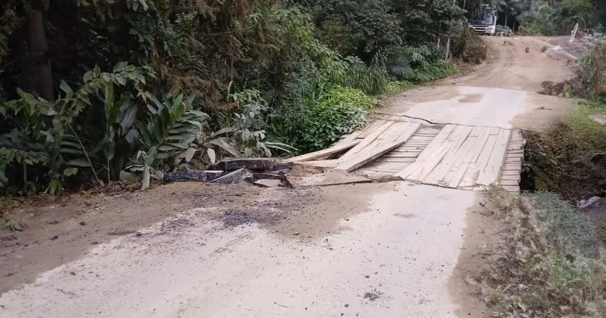 Uma das estruturas de uma ponte de madeira na rua José Dada, no Cedro Alto, cedeu nesta sexta-feira, 23, em Brusque. Equipes da Secretaria de Obras e Serviços Urbanos foram até o local fazer a avaliação do problema, que deve ser resolvido na manhã deste sábado, 24.