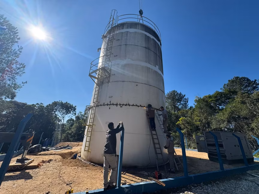 Nos próximos dias, os trabalhos seguem com a soldagem das conexões e, na sequência, será feita a aplicação da pintura interna, utilizando o revestimento adequado para garantir a qualidade da água armazenada. Após isso, será iniciado o processo de testes de reservação, que tem como objetivo verificar possíveis vazamentos antes da estrutura entrar em operação.