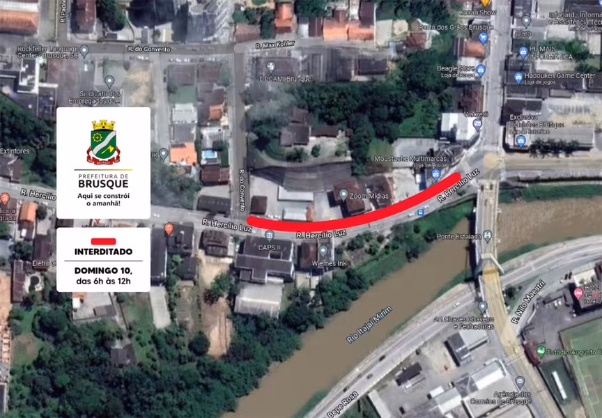 Na manhã deste domingo, 10, parte da rua Hercílio Luz estará interditada, no Centro. Conforme a Secretaria de Obras, da Prefeitura de Brusque, durante o período das 6h às 12h serão feitos reparos na tubulação de drenagem pluvial.