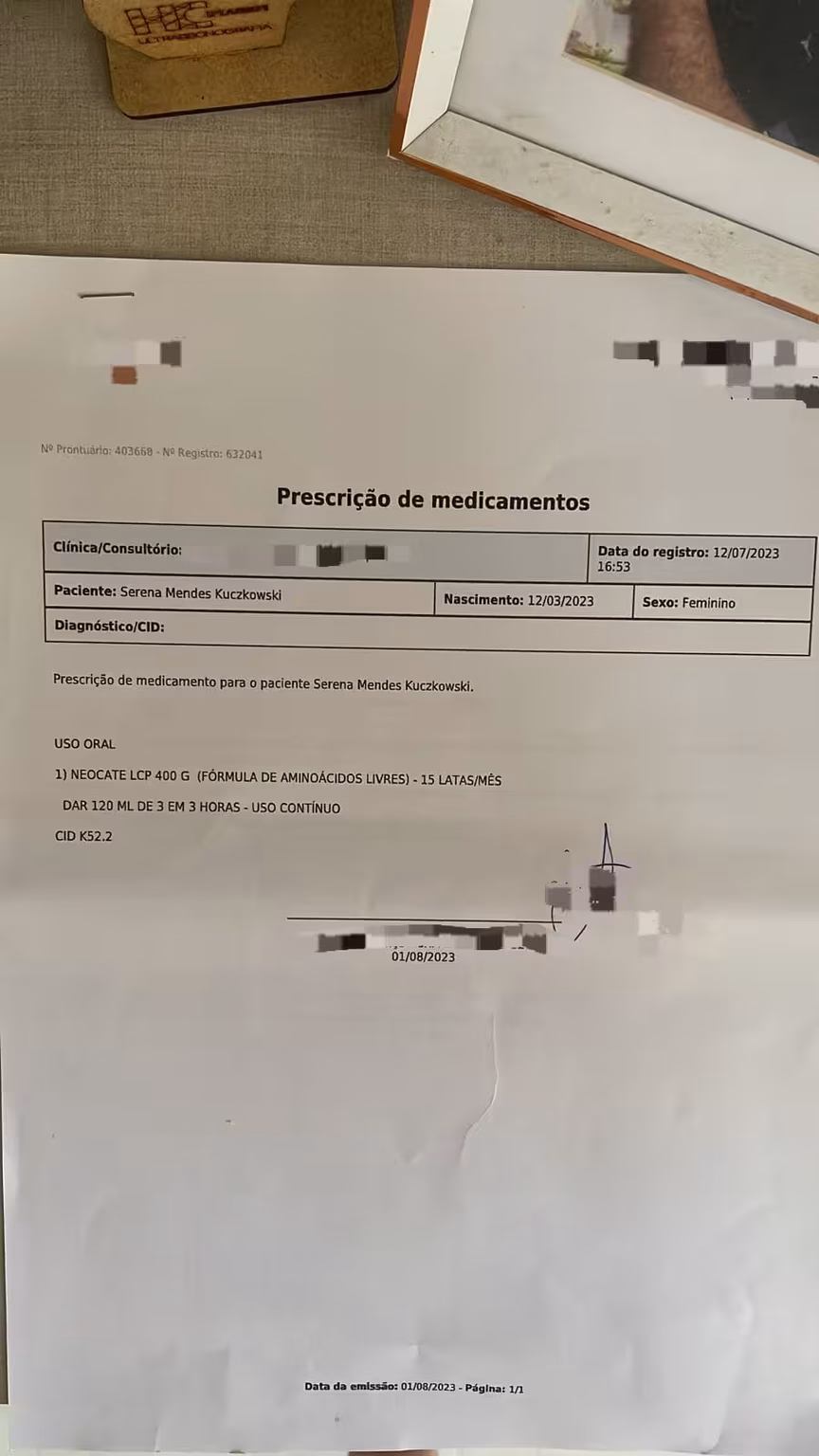 Além dos remédios, Serena faz consultas com uma gastropediatra em Balneário Camboriú, para examinar suas alergias alimentares. A família precisou recorrer ao médico particular pelo fato da consulta na rede pública não ter sido agendada. No município também são realizadas consultas com um alergista.