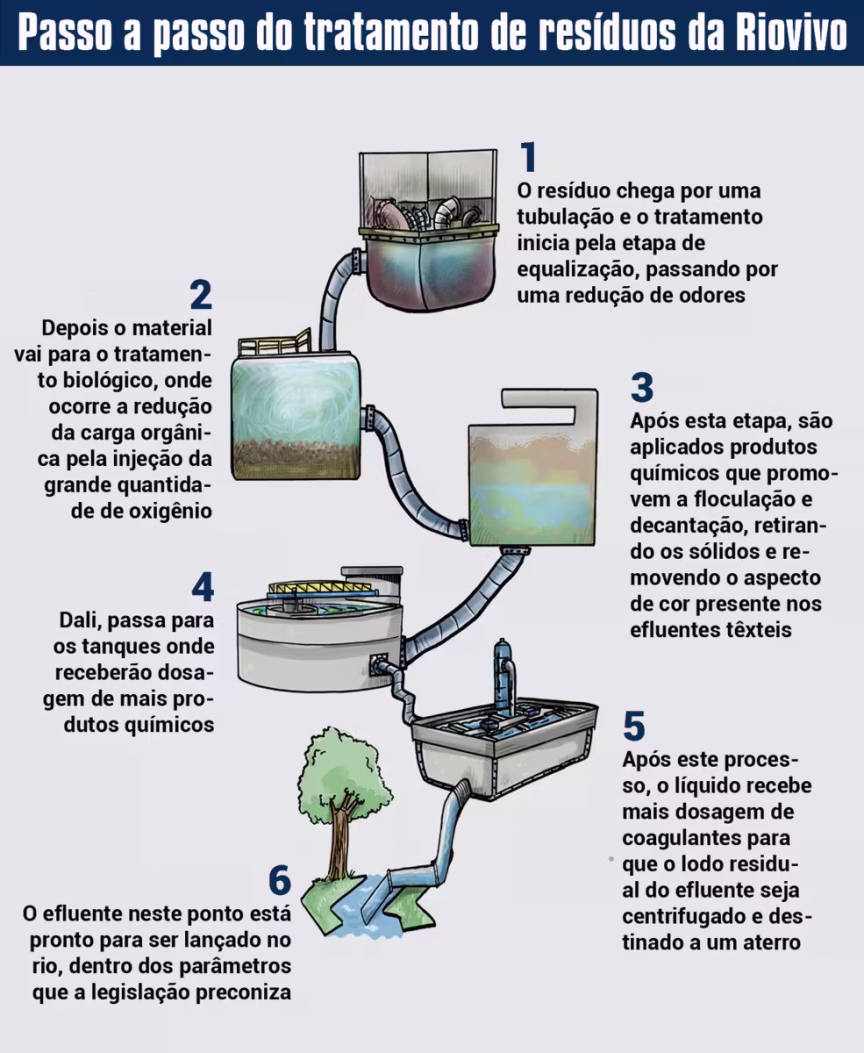 A Riovivo estima que Brusque gera em torno de 1 milhão de metros cúbicos de efluentes líquidos por mês. Desses, segundo o cálculo da empresa, 500 mil metros cúbicos é de esgoto doméstico e o restante é de efluente industrial de vários setores. A Riovivo trata na faixa de 200 mil metros cúbicos por mês, ou seja, pelo levantamento da empresa, em torno de 800 mil metros cúbicos são descartados diretamente no rio Itajaí-Mirim mensalmente.