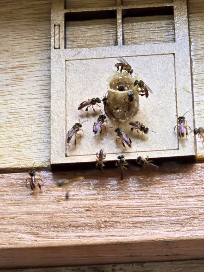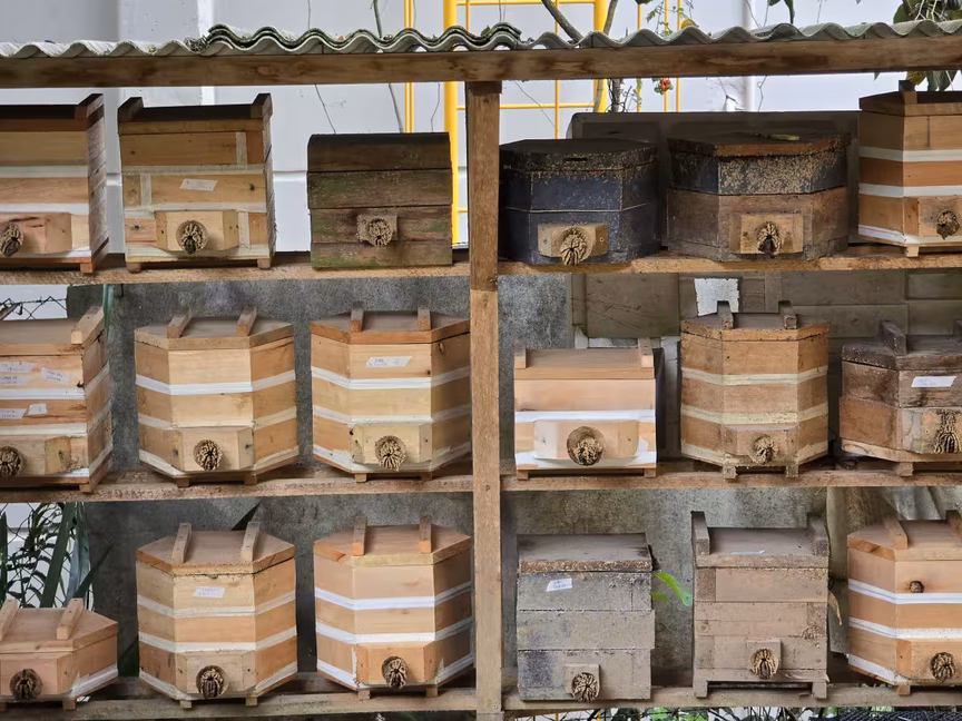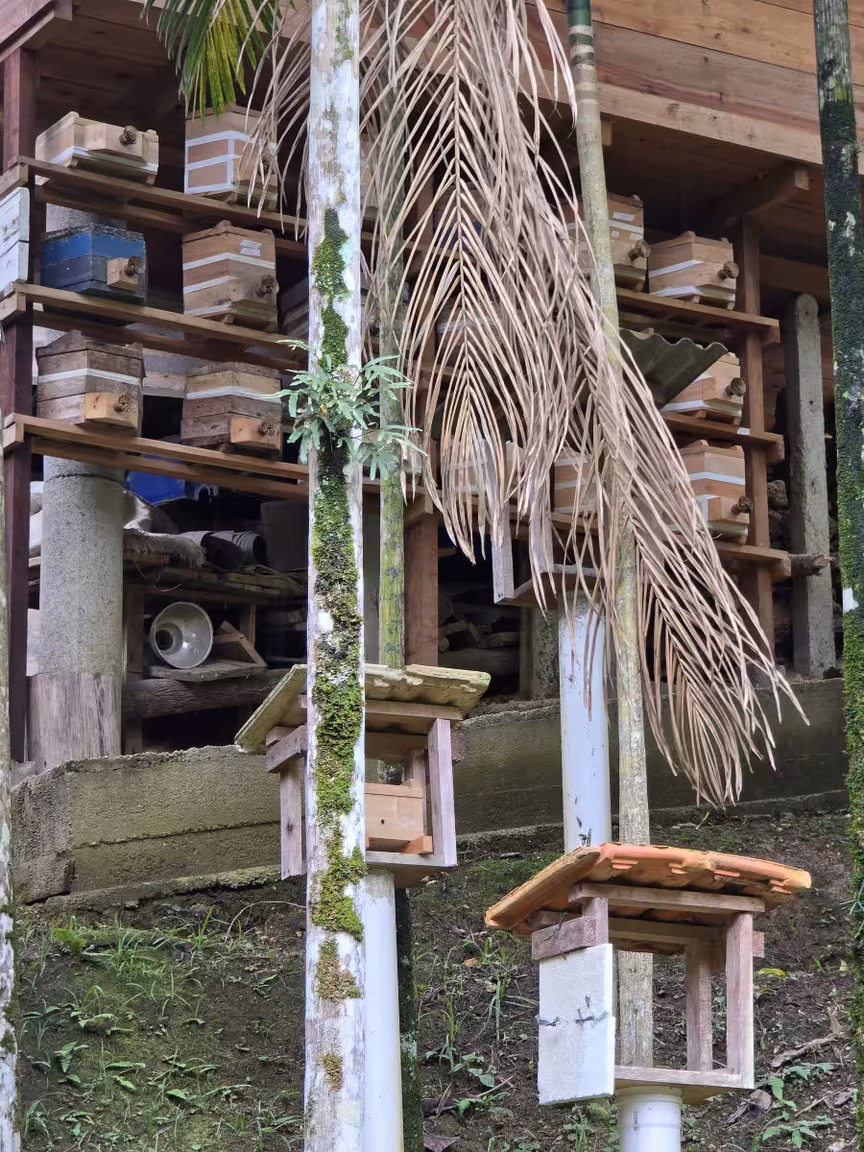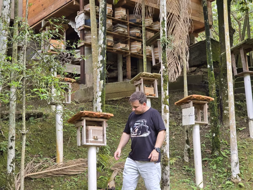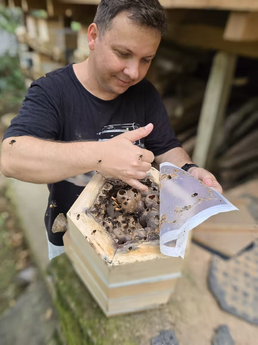 Em sua casa, Luciano então dedicou um espaço exclusivo para o meliponário, onde o som suave do zumbido das abelhas cria uma atmosfera quase mágica.