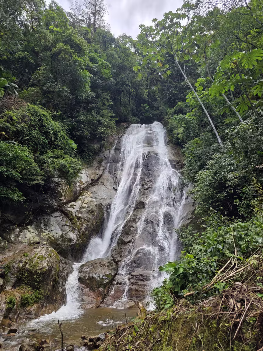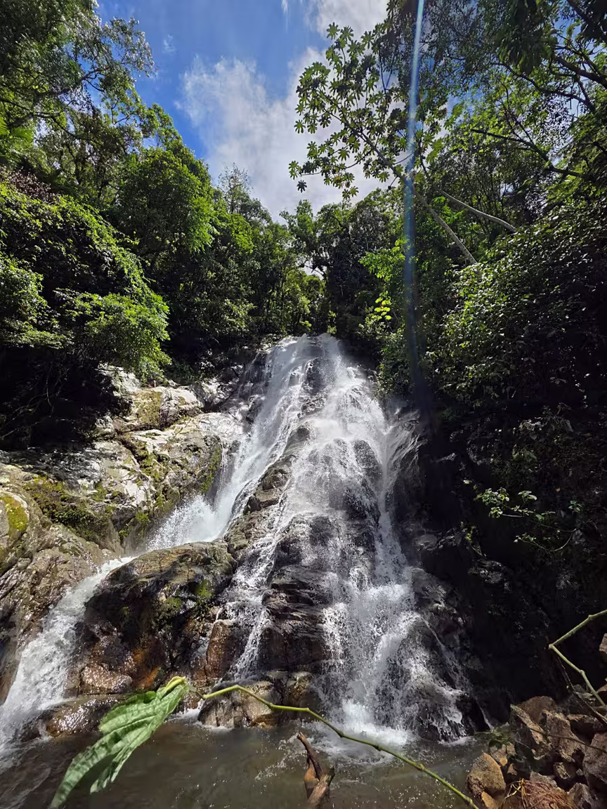 O ponto retratado se destaca por uma queda d’água com cerca de 60 metros de altura, projetada de forma contínua sobre formações rochosas, conferindo imponência ao cenário.