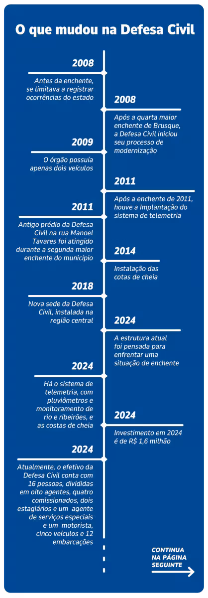 Após a inundação de 2008, considerada a quarta maior do município, melhorias foram feitas na estrutura e no contingente da Defesa Civil. “De lá para cá, a gente teve um aumento no efetivo. Por exemplo, essa estrutura que tem hoje foi construída pensando numa situação de evento [de enchente].”